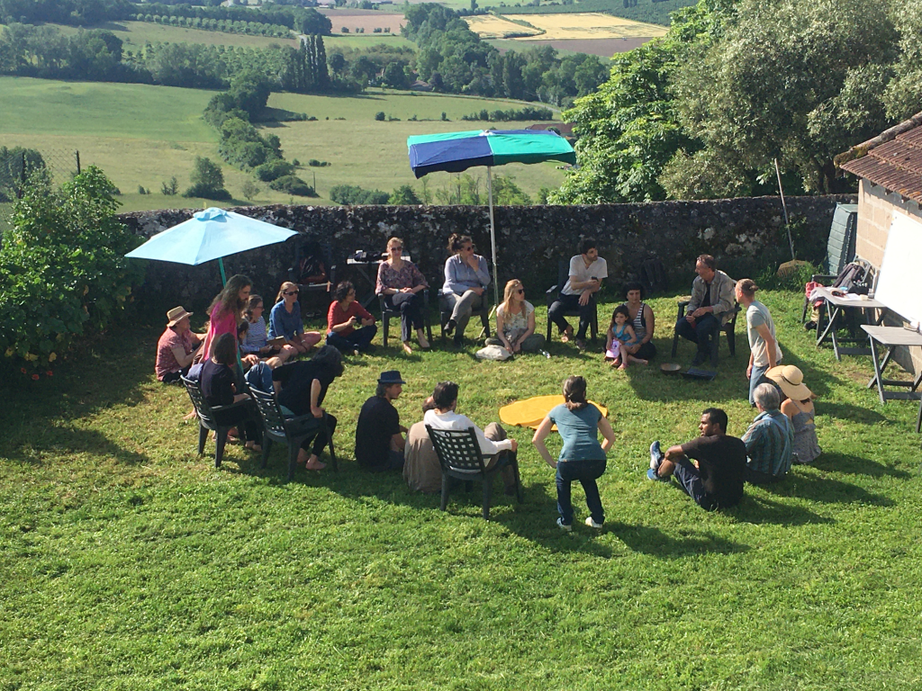 D’ailleurs, en parlant de permaculture humaine, et parmi la multitudes d’outils que j’ai maintenant à ma disposition, le soutien inter-humain passe aussi pour moi par des cercles d’hommes, que nous organisons parfois avec les copains de TERA. Alors non, il ne s’agit pas de chanter Kumbaya au coin du feu ou d’expériences particulièrement ésotériques, mais plutôt de se retrouver entre hommes (entre 4 et 8 participants en général), dans un cadre de confidentialité et de sécurité, pour pouvoir déposer ce qu’on a à déposer, recevoir de l’écoute, écouter les autres. Les processus sont très simples, ça permet de faire du lien, de prendre des nouvelles, de recevoir du soutien. On organise ça toutes les 6 semaines quand on y pense, de façon plus espacée quand on oublie. Les femmes le font aussi entre elles parfois, et bien sûr c’est complémentaire des espaces mixtes qu’on peut s’offrir ici (réseau TERA) pour faire du lien. C’est juste différent et agréable, de profiter d’échanges un peu cadrés qui permettent une meilleure qualité d’écoute mutuelle, plutôt que de juste refaire le monde en buvant des bières (ce qui est très bien par ailleurs et dont personne ne se prive ici).