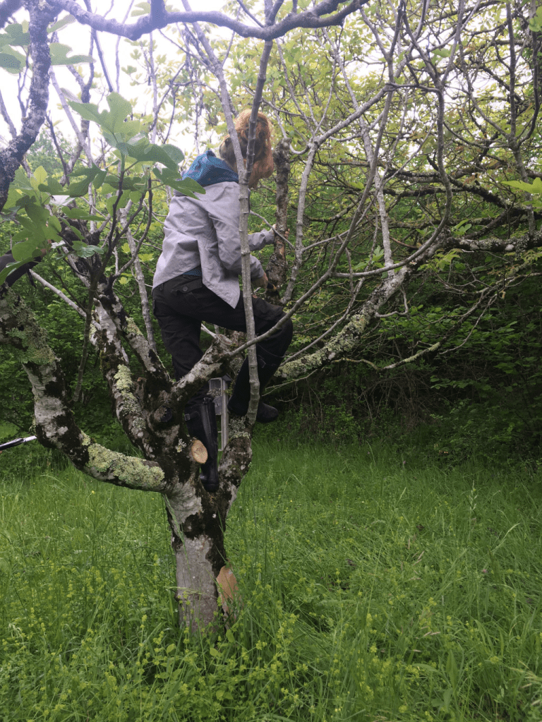 Lisa en train de tailler le bois mort d’un figuier, dans le verger de Lartel